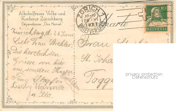 13774393 alte Postkarte Zuerichberg ZH Alkoholfreis Volks- und Kurhaus Dependance Das Heimeli Kuenstlerkarte postalisch gelaufen Erhaltung siehe scans [FriedD77] KatCode: 11470520525074