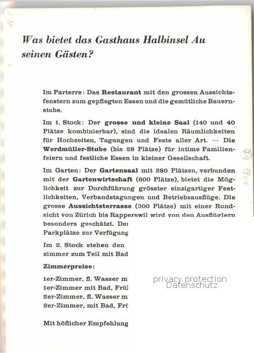 12729291 Zuerichsee ZH Gasthaus Halbinsel Au postalisch nicht gelaufen Werbekarte (keine Postkarte) Erhaltung siehe scans [WerneD78] KatCode: 11470260925666