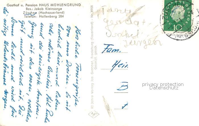 73711655 alte Postkarte Zueschen Sauerland Gasthof Pension Haus Muehlengrund Nuhnetal mit Winterberg postalisch gelaufen Erhaltung siehe scans [WerneD78] KatCode: 11110005958048