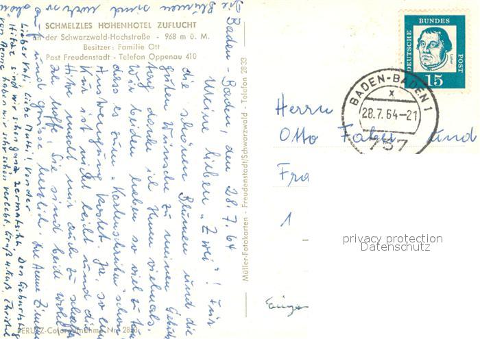 73645070 alte Postkarte Zuflucht Schmelzles Hoehenhotel Restaurant im Schwarzwald postalisch gelaufen Erhaltung siehe scans [FriedD77] KatCode: 11110008317008