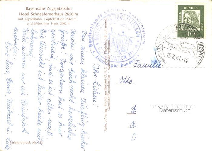 72374337 alte Postkarte Zugspitze Hotel Schneefernerhaus Gipfelbahn Station Muenchner Haus postalisch gelaufen Erhaltung siehe scans KatCode: 11110009180117