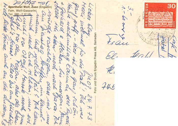 13889401 alte Postkarte Zuoz GR Sporthotel Wolf postalisch gelaufen Erhaltung siehe scans [WerneD78] KatCode: 11470100335254