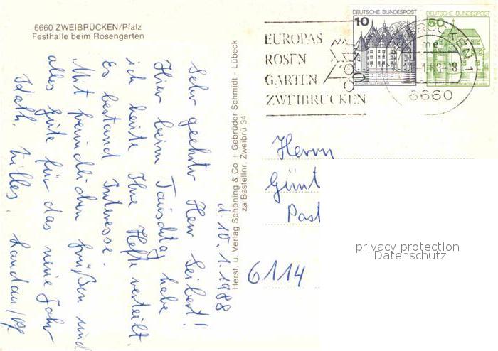 72818237 alte Postkarte Zweibruecken Festhalle Rosengarten postalisch gelaufen Erhaltung siehe scans [NatalD47] KatCode: 11110007320000