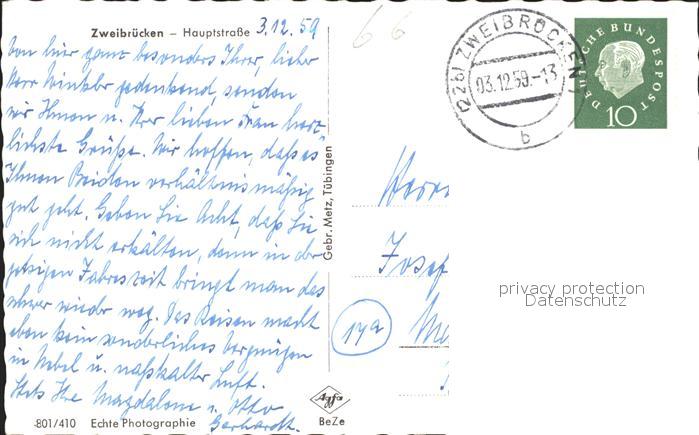 41792442 alte Postkarte Zweibruecken Hauptstrasse postalisch gelaufen Erhaltung siehe scans KatCode: 11110007320000