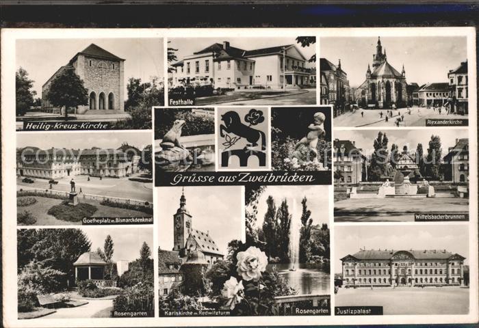 41753806 alte Postkarte Zweibruecken Heilig Kreuz-Kirche Alexander Kirche Justizpalast postalisch gelaufen Erhaltung siehe scans KatCode: 11110007320000