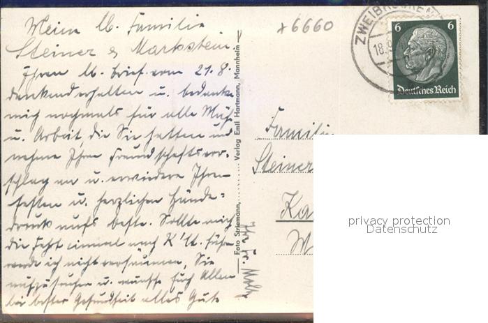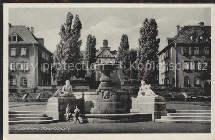41756896 alte Postkarte Zweibruecken Mannlichplatz Brunnen Skulptur postalisch gelaufen Erhaltung siehe scans KatCode: 11110007320000