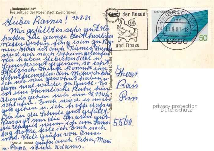 73172494 alte Postkarte Zweibruecken Pfalz Badeparadies postalisch gelaufen Erhaltung siehe scans [NatalD47] KatCode: 11110007320000