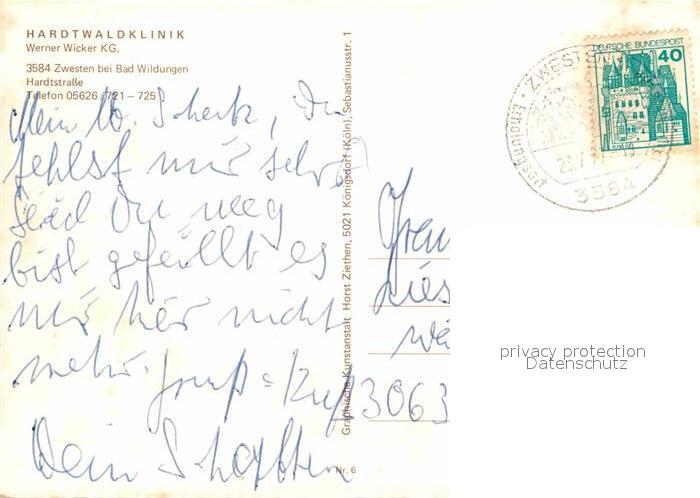 72764447 alte Postkarte Zwesten Bad Wildungen Hardtwaldklinik postalisch gelaufen Erhaltung siehe scans [AndreD76] KatCode: 11110006635003