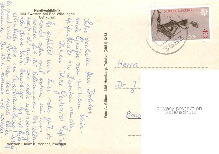 73184140 alte Postkarte Zwesten Bad Wildungen Hardtwaldklinik postalisch gelaufen Erhaltung siehe scans [LiesaD40] KatCode: 11110006635003