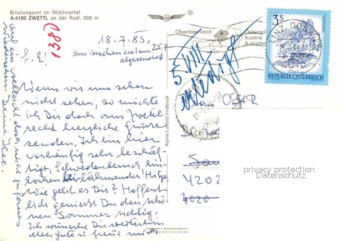 72673411 alte Postkarte Zwettl Rodl Erholungsort Fliegeraufnahme postalisch gelaufen Erhaltung siehe scans [FriedD77] KatCode: 11390313041627