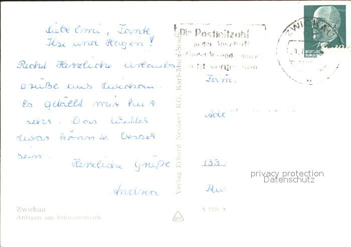 72008120 alte Postkarte Zwickau Sachsen Anlagen am Schwanenteich postalisch gelaufen Erhaltung siehe scans KatCode: 11110014167000