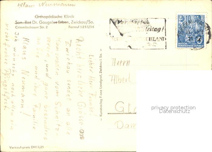 72549053 alte Postkarte Zwickau Sachsen Orthopaedische Klinik postalisch gelaufen Erhaltung siehe scans [LiesaD40 kv021box] KatCode: 11110014167000