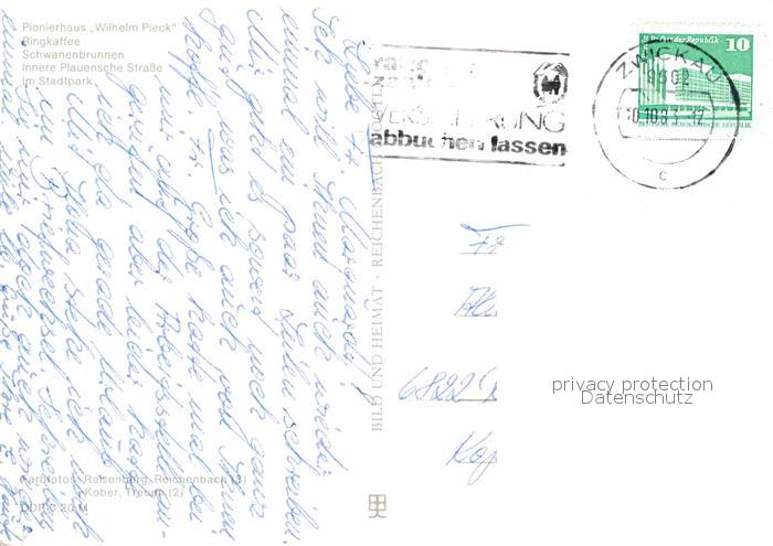 72854783 alte Postkarte Zwickau Sachsen Pionierhaus Wilhelm Pieck Ringkaffee Schwanenbrunnen postalisch gelaufen Erhaltung siehe scans [AndreD76] KatCode: 11110014167000