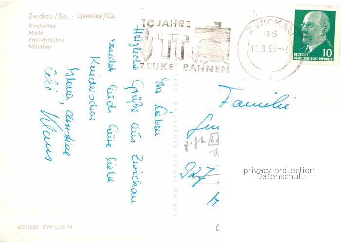 72749792 alte Postkarte Zwickau Sachsen Ringkaffee Markt Freilichtbuehne Milchbar postalisch gelaufen Erhaltung siehe scans [KathaD81] KatCode: 11110014167000