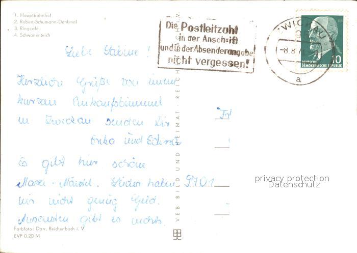 72382778 alte Postkarte Zwickau Sachsen Robert Schumann Denkmal RingCafe Schwanenteich postalisch gelaufen Erhaltung siehe scans KatCode: 11110014167000