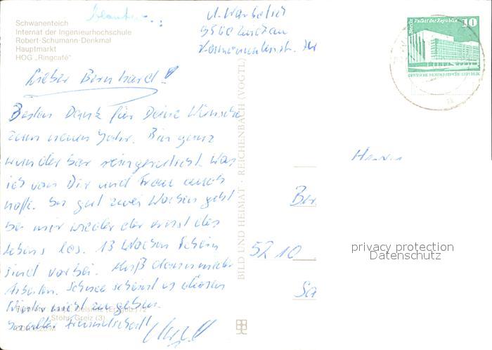 72261776 alte Postkarte Zwickau Sachsen Schwanenteich Internat Ingenierhochschule Robert Schumann Denkmal Markt HOG Ringcafe postalisch gelaufen Erhaltung siehe scans KatCode: 11110014167000