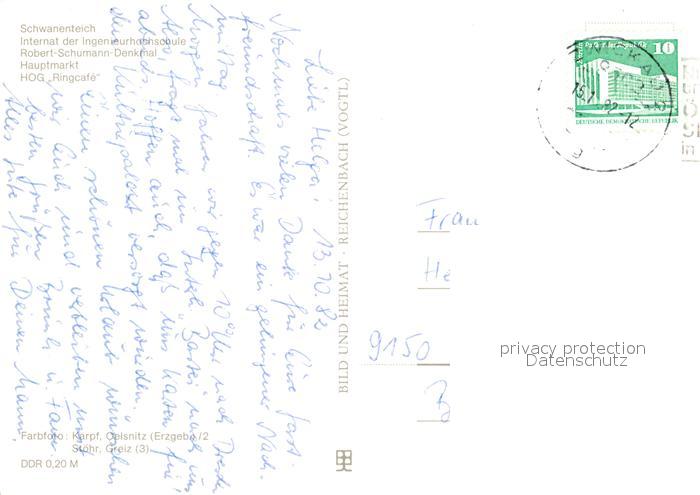 73183046 alte Postkarte Zwickau Sachsen Schwanenteich Internat Ingenieurhochschule Robert Schumann Denkmal Hauptmarkt HOG Ringcafe postalisch gelaufen Erhaltung siehe scans [FriedD77] KatCode: 11110014167000