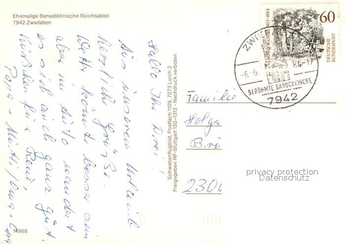 72954680 alte Postkarte Zwiefalten Wuerttemberg Benediktinische Reichsabtei Fliegeraufnahme postalisch gelaufen Erhaltung siehe scans [PaolaD17] KatCode: 11110008415085