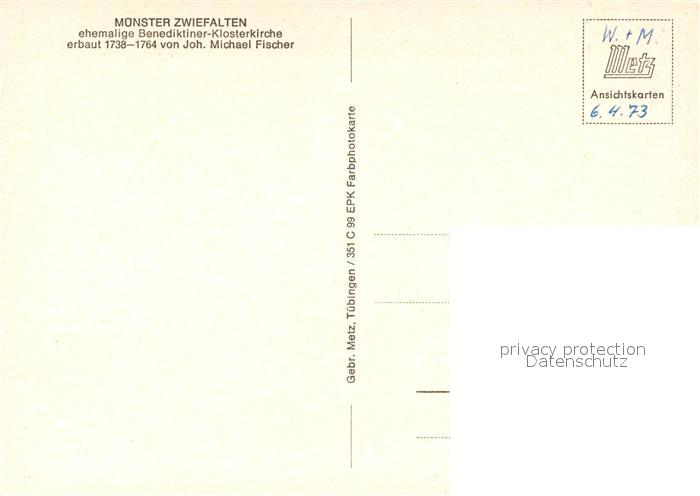 73310149 Zwiefalten Wuerttemberg Ortsansicht mit Muenster ehemalige Benediktiner Klosterkirche 18. Jhdt. Schwaebische Alb postalisch nicht gelaufen Erhaltung siehe scans [FriedD77] KatCode: 11110008415085