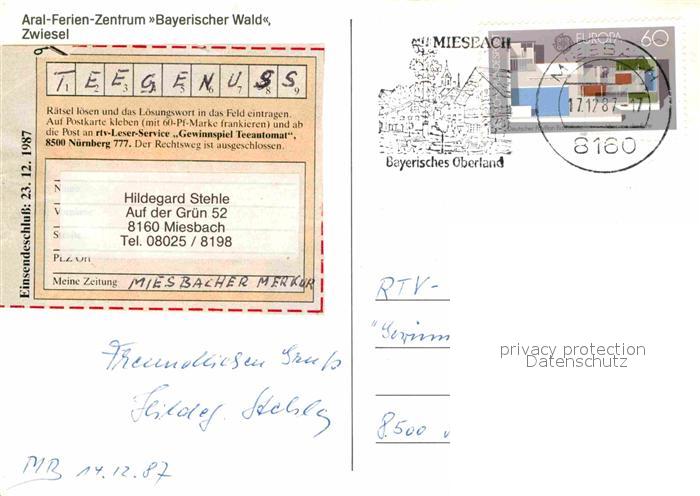 72701002 alte Postkarte Zwiesel Niederbayern Aral Ferienzentrum Bayerischer Wald Fliegeraufnahme Blaue Wiese Fliegenpilz postalisch gelaufen Erhaltung siehe scans [FriedD77] KatCode: 11110009276148