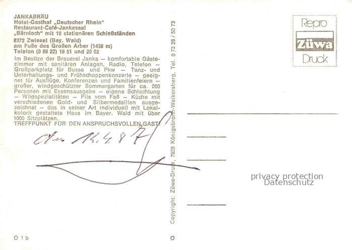74033799 Zwiesel Niederbayern Jankabraeu Hotel Gasthof Deutscher Rhein Restaurant postalisch nicht gelaufen Erhaltung siehe scans [FriedD77] KatCode: 11110009276148