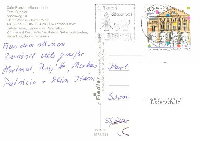 72883990 alte Postkarte Zwiesel Niederbayern Pension Sonnenhof Terrasse Hallenbad postalisch gelaufen Erhaltung siehe scans [FriedD77] KatCode: 11110009276148