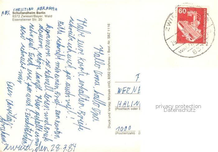 73707694 alte Postkarte Zwiesel Niederbayern Schullandheim Berlin postalisch gelaufen Erhaltung siehe scans [WerneD78] KatCode: 11110009276148