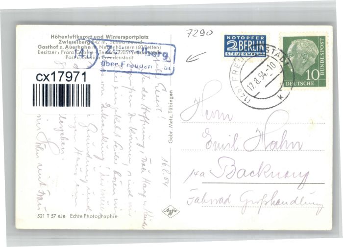 30727903 alte Postkarte Zwieselberg Freudenstadt Gasthof Pension Auerhahn postalisch gelaufen KatCode: 11110008237028