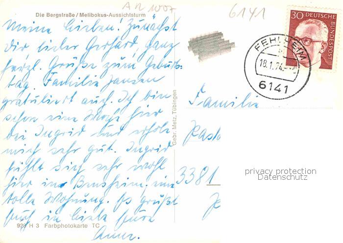 72878893 alte Postkarte Zwingenberg Bergstrasse Melibokus Aussichtsturm postalisch gelaufen Erhaltung siehe scans [FriedD77] KatCode: 11110006431022