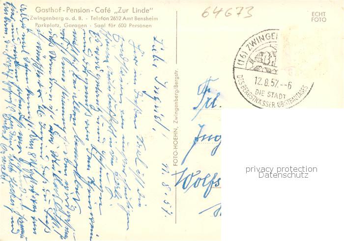 73855327 alte Postkarte Zwingenberg Bergstrasse Ortsansicht mit Kirche Gasthof Pension Cafe Zur Linde postalisch gelaufen Erhaltung siehe scans [FriedD77] KatCode: 11110006431022